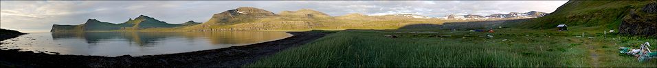 Auf dem Zeltplatz stehen eine gutes Dutzend Zelte die den Gruppen gehören, die mir heute begegnet sind. Etwas später treffen auch die beiden Belgier am Zeltplatz ein. Am Abend steige ich noch den Hang hinauf um ein Panorama der Hornvík aufzunehmen. Bei der Rettungshütte befinden sich drei Ruinen der verlassenen Siedlung. Mache noch einen Spaziergang über den schwarzen Sandstrand, an den sanft die Wellen plätschern. Morgen steht mit der Atlaskarð wieder ein Pass an - also werde ich etwas früher aufstehen.