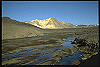 Ich habe schon etwa die Höhe seines Gipfels erreicht. Nach meiner Karte müßte mit diesem Hang hier der Anstieg zu Ende sein. Aber nach Westen öffnet sich ein weiter ansteigendes kleines Hochtal mit weiten Schneefeldern. Ich suche meinen Weg über feinen Hangschutt und hellgrauen Sinterbildungen. Überall in den Rinnen kleine Dampf- und Wasserquellen die leise vor sich hin zischen und blubbern. Der Bach, in dem v-förmig eingeschnittenen Tälchen, ist zum großen Teil von Altschnee überdeckt. Finde einen kurze Markierungspflock, der den Wanderweg von Nýdalur aus anzeigt. Am Ende des Tales noch einmal etwa 100 m steil zu einem Paß hinauf. Deutlich sind nun die Spuren des "Weges" zu erkennen. Eine weiterer Pflock markiert schließlich die Paßhöhe selbst. Ein kurzer Blick zurück zur Báðarbunga und zum Vatnajökull. Nach Westen habe ich nun die Sicht auf den Hofsjökull - er wird nun das nächste Ziel sein.
