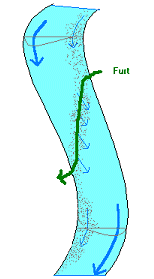 Wo verläuft der Stromstrich? Vorsicht wenn er vor dem gegenüberliegendem Ufer verläuft man stellt dann unter Umständen erst seht spät fest, daß man die letzten fünf Meter nicht mehr schafft. Deshalb möglichst nie in einer Flußbiegung von innen nach außen, also vom Gleithang zum Prallhang furten.