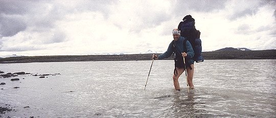 Irgendjemand hat einmal gesagt,daß es in Island zwei Arten von Bächen gibt. Die mit 4 °C und die mit weniger als 4 °C. Da ist was dran, denn wenn unser Bach nicht gerade Varmá oder Varmalækur heißt, dann wird er nicht von heißen Quellen gespeist. Eine Furt ist in jedem Fall ein erfrischendes Erlebnis. Ist das Gletschertor noch in Sichtweite dann darf man sich auch auf Wassertemteraturen um die 0 °C gefasst machen. Auf dem Efirðingavegur am Nordrand des Hofsjökull entlang darf man an einem Tag 10 (breite) Flüsse diese Typs furten. Sicher ist Kälteempfinden auch subjektiv und deshalb man sollte auch eine wenig zimperliche Grundeinstellung zur Furt mitbringen. Fließendes Wasser im 0°C Bereich wird schon nach weniger als einer Minute als sehr schmerzhaft empfunden. Es empfiehlt sich breite Furten zügig und entschlossen zu queren bevor die Muskulatur anfängt sich zu verkrampfen. Es ist immer wieder erstaunlich, wie schnell man wieder warme Füße bekommt, sobald man sie abgetrocknet hat und wieder in die Socken und Stiefel geschlüpft ist. Für die Anregung der Durchblutung scheint es nichts besseres zu geben als eine solche "Kneipp-Anwendung". Ein Schluck heisser Tee nach der Furt bewirkt ebenfalls kleinere Wunder