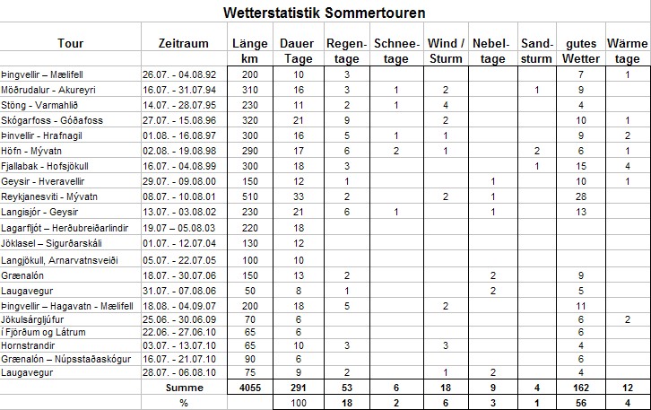 Die folgende Statistik zeigt die Wetterbedingungen während 11 Trekkingtouren im Hochland zwischen 1992 und 2003. Die Touren dauerten zwischen knapp 2 und 5 Wochen und fanden im jeweils Zeitraum zwischen Anfang Juli und Mitte August statt. Diese Zeit ist die Hauptreisezeit für das Hochland und so kann diese Statistik als einigermaßen repräsentativ für diesen Zeitraum angesehen werden.